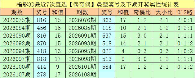 上期开出奖号278,其奇偶类型为:偶奇偶,该类型组合历史上开出了1107期,最近100期开出了20期。